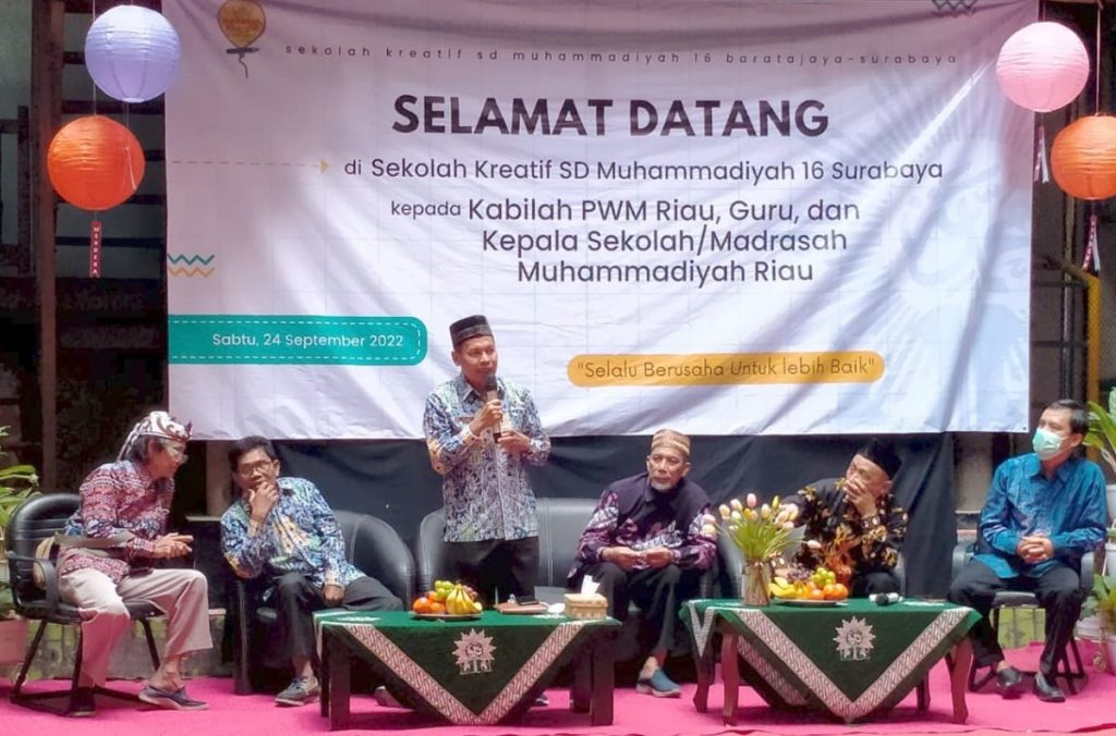 Kepala Sekolah Kreatif SD Muhammadiyah 16 Surabaya, Suyono SSi menyambut rombongan dengan hangat. “Selamat datang rombongan Pimpinan Wilayah Muhammadiyah (PWM) Riau di Sekolah Kreatif Baratajaya. Terima kasih sudah berkenan hadir di sini,” ucapnya.