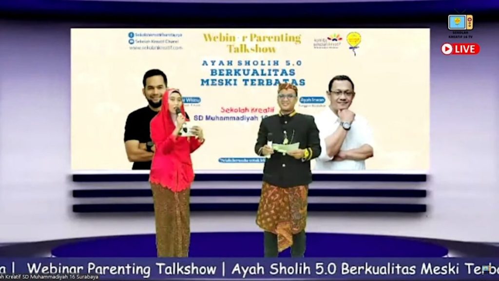 SEKOLAHKREATIF.COM – Komite Sekolah Kreatif SD Muhammadiyah 16 Surabaya menggelar Webinar dan Talkshow Parenting Ayah Sholih 5.0 Berkualitas meski Terbatas dengan narasumber Ayah Irwan dan Teuku Wisnu, Sabtu (26/3/2022).